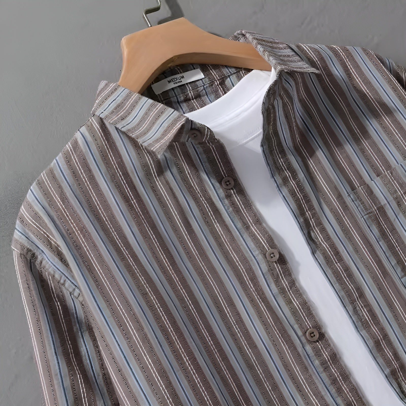 Inspired by Japanese comfort-first design, this striped shirt blends relaxed style with everyday ease. It drapes naturally with a soft texture that layers effortlessly over anything. The muted pinstripes and clean lines give it a calm, minimal look that pairs with just about everything.