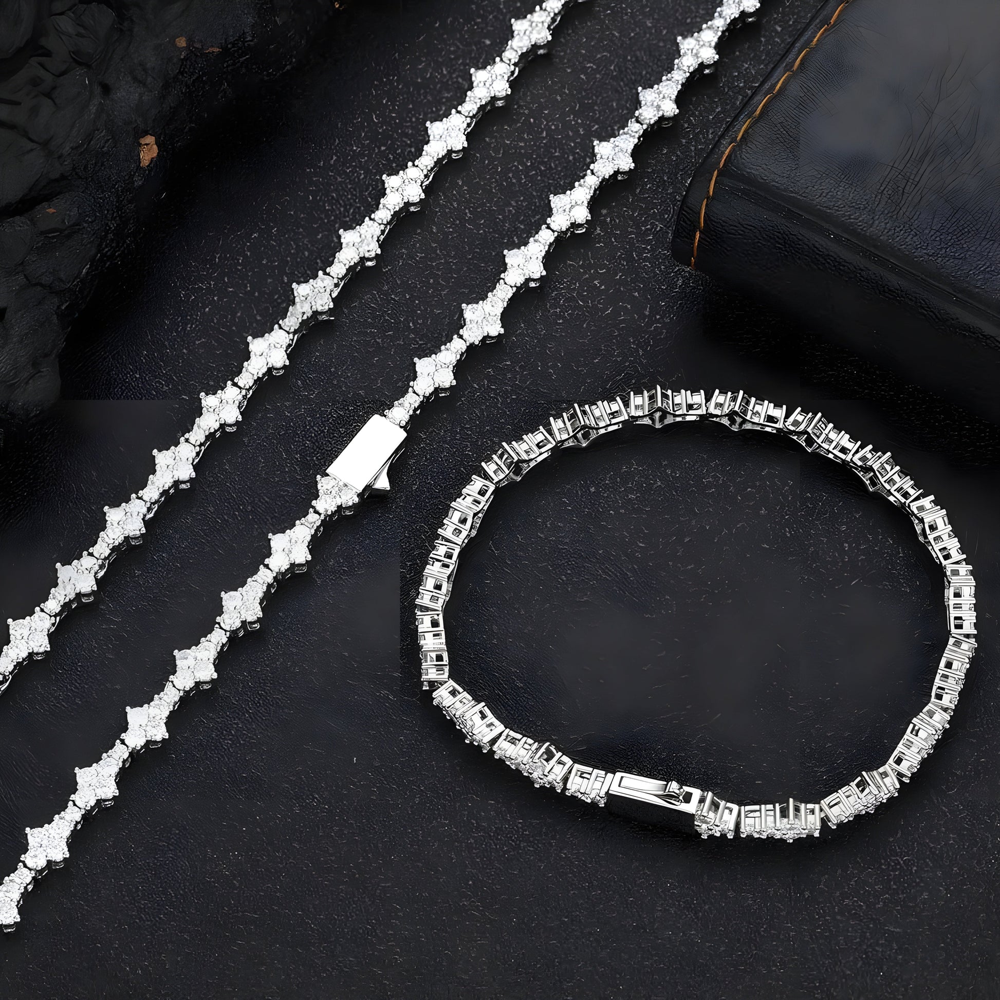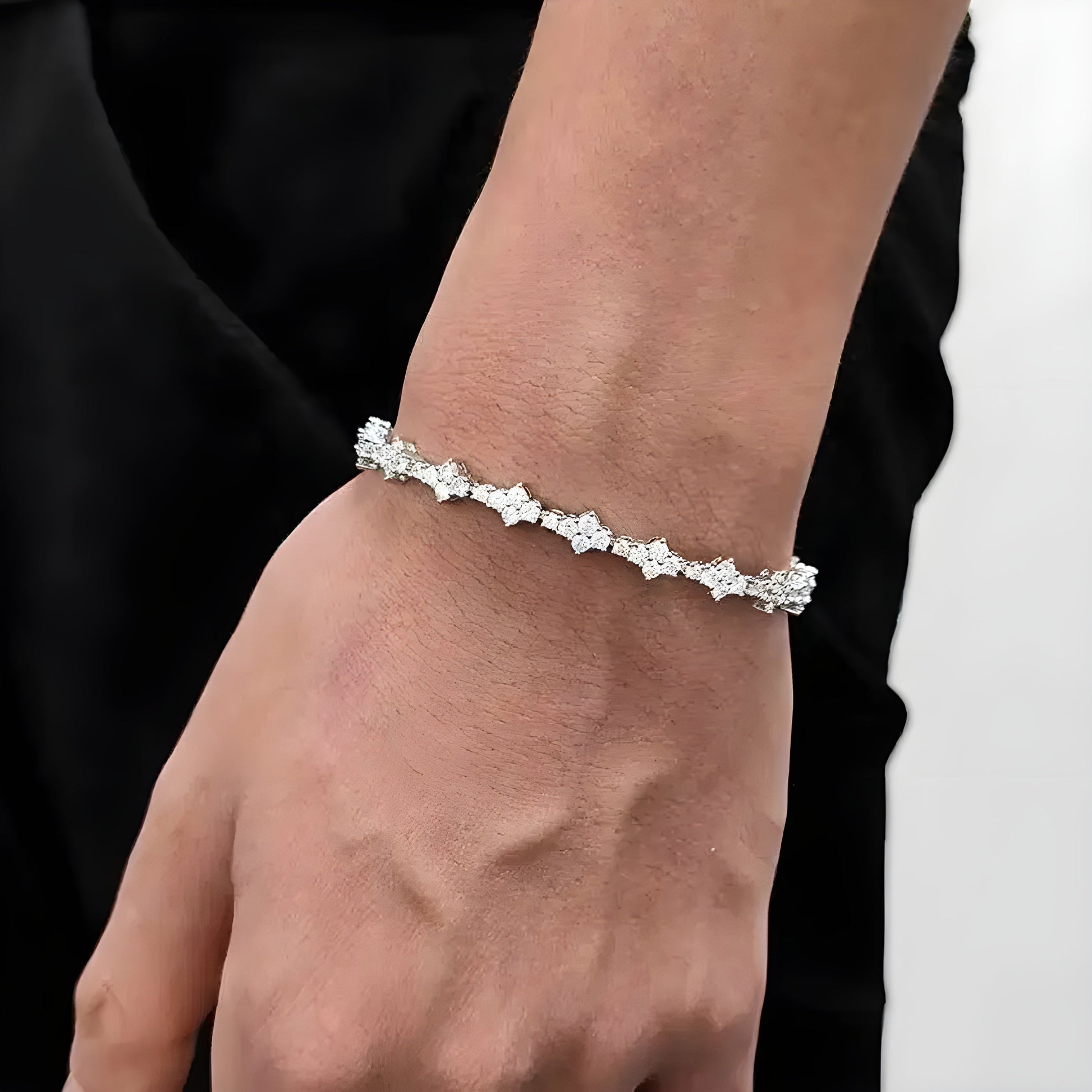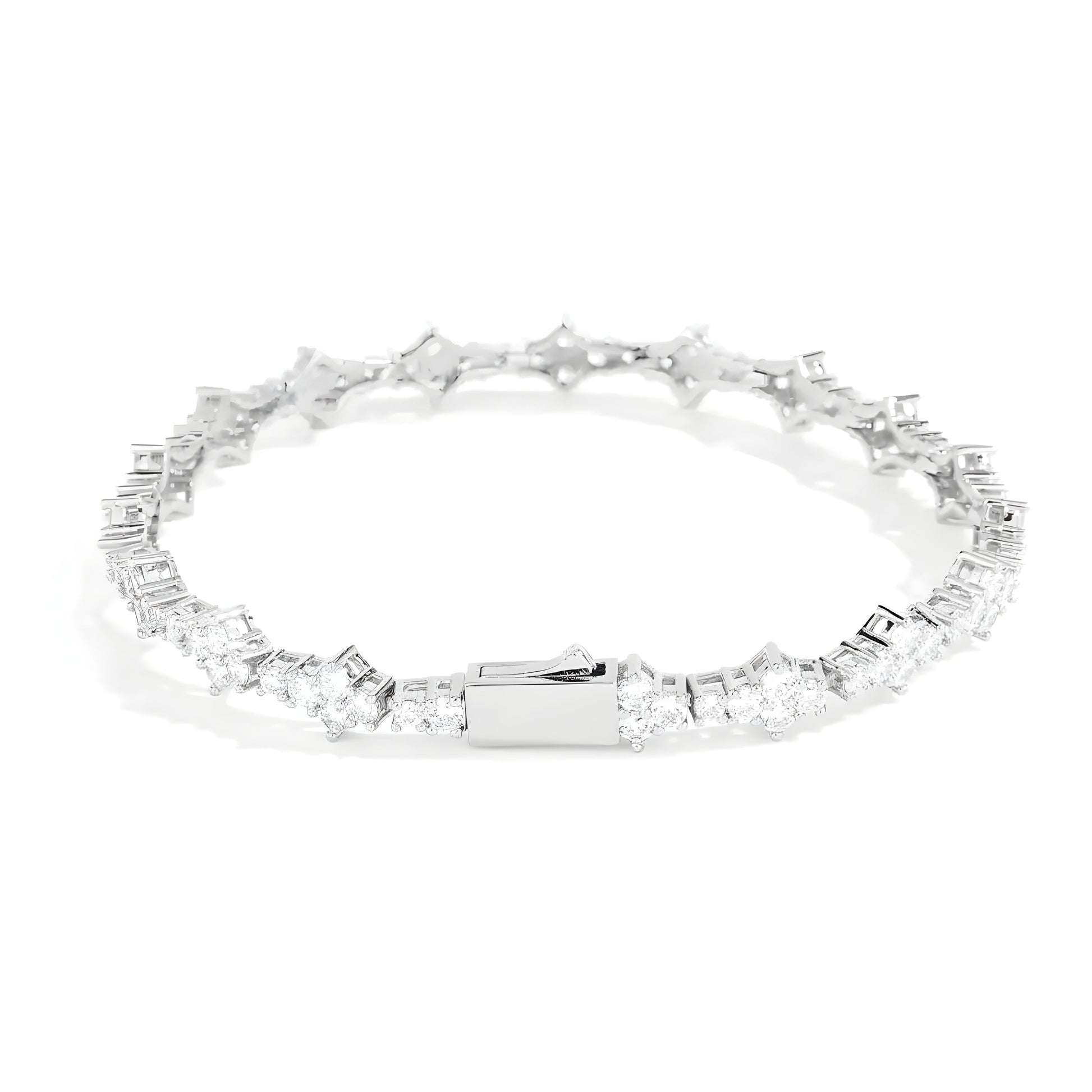 Sparkling rhinestones, beautifully tucked into a diamond-shaped prong basket to create a four-petal flower stone, linked by a durable silver metal in a cable design. Flexible, lightweight, and easy to latch, a refined accent to your everyday look.