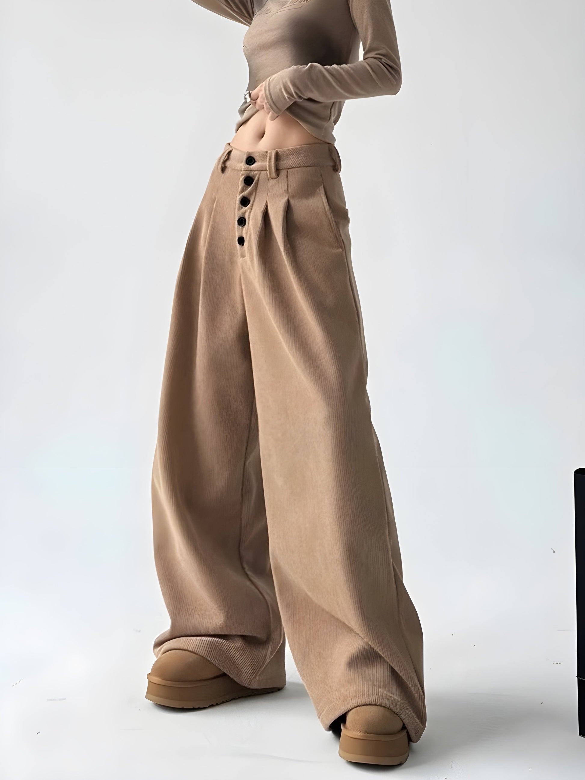 Cute pleats and multiple bold buttons adorn the cinched high waist, crafted from soft, heavy-duty corduroy in solid colors. Draped in a chic oversized fit, the straight, loose cut and wide palazzo legs enhance its effortlessly stylish, casual appeal.