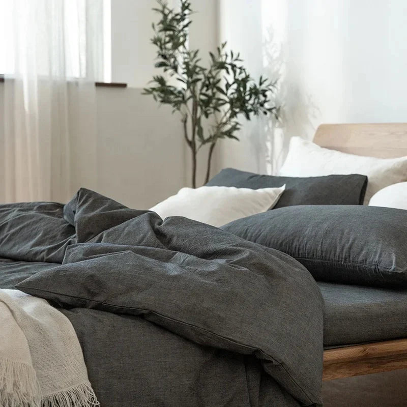Create your personal sanctuary with our Japanese Style Cotton Duvet Cover Set. Its minimalist design and calming dark gray tones instantly transform your space into a serene retreat, promoting peaceful sleep and tranquil mornings.