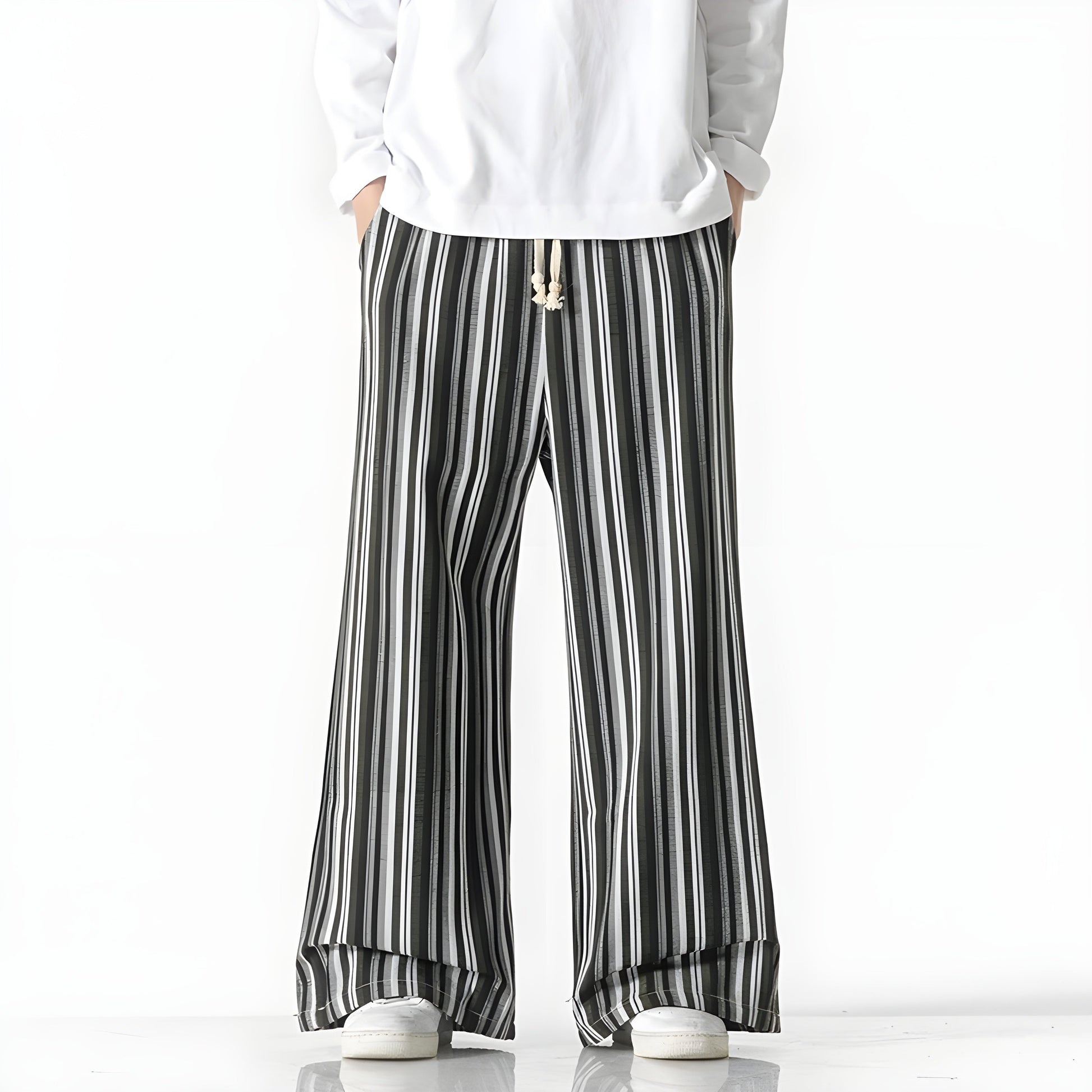 An Eastern traditional comfort design, soft, breathable, cotton build tailored to a relaxed fit. Alternating stripes cascade with the straight loose-silhouette, draping on the feet in a wide-leg cut, a casual fit that pairs easily with plain colors.